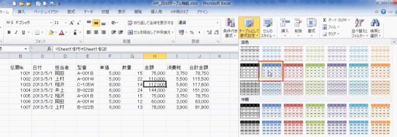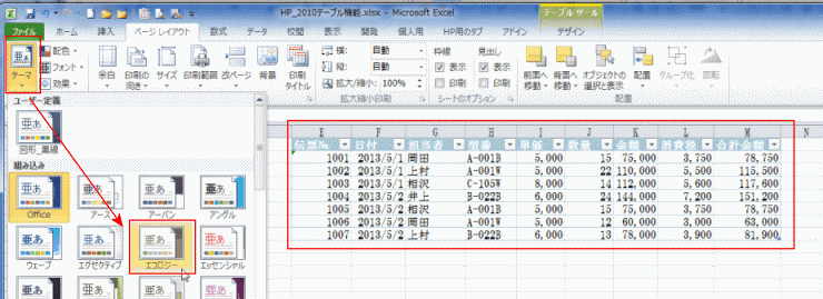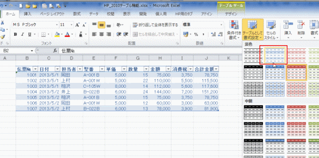 テーブルのテーマに応じた書式を確認することができます。
