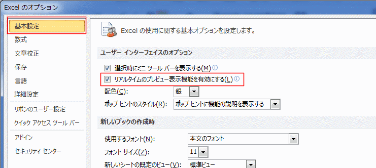 よねさんのExcelとWordの使い方|エクセル2010 基本講座:目次|画面表示|リアルタイムのプレビュー表示機能の設定