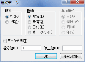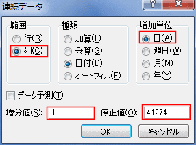 - 範囲は「列」を選択します。種類は「加算」、増分値は「1」、停止値は「41274」として[OK]ボタンをクリックします。