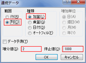 - 範囲は「列」を選択します。種類は「加算」、増分値は「2」、停止値は「1000」として[OK]ボタンをクリックします。