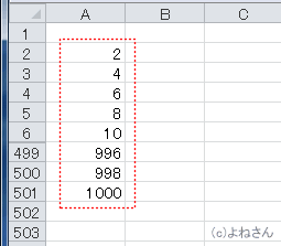 - 行方向へ2,4,6,8・・・・1000までの連続データを作成する例です。