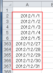 - 2012/1/1〜2012/12/31までの連続データが行方向へ作成されました。