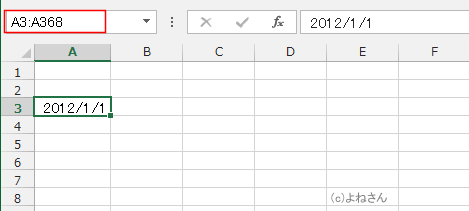 かずでは「A3:A368」と入力しています。入力後、[Enter]キーを押すと範囲が選択されます。