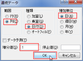 - 範囲で「列」、種類で「日付」、増加単位で「日」を選択しています。