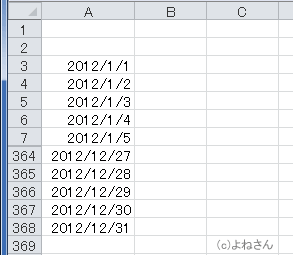 - 行方向へ2012年の1年分の日付を入力してみます。