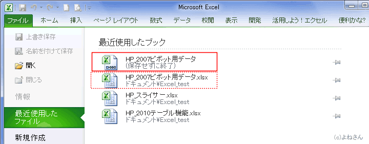 - [ファイル]をクリックしてBackstage ビューを開き、「最近使用したファイル」を選択すると(保存せずに終了)と記されたファイルがあります。