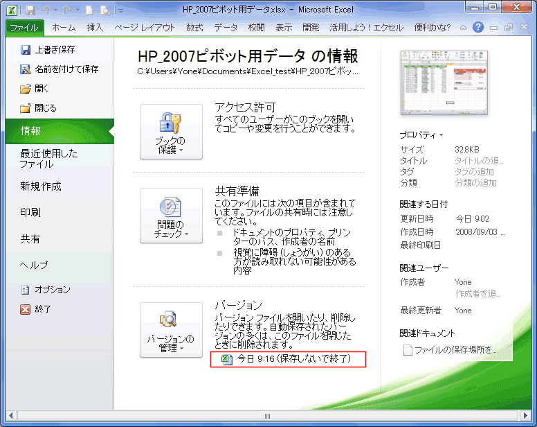 - 以前の保存していたファイルを開き、[ファイル]→[情報]を選択すると、バージョン管理のところに(保存せずに終了)したファイルがあることがわかります。