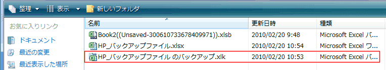 すると、「・・・・のバックアップ.xlk」といったファイルが毎回作られます。