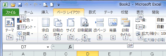 - この状態で[P]キーを押すと「ページレイアウト」タブに切り替わり、さらに各コマンドのショートカットキーが表示されます。