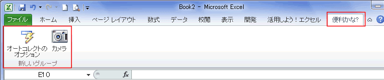 - [便利かな?]タブが作成され、[新しいグループ]に「カメラ」コマンドなどが登録されました。