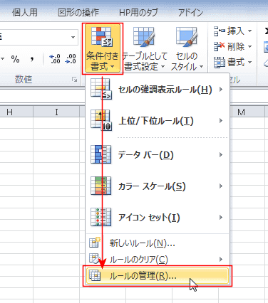 - [ホーム]タブの[条件付き書式]→[ルールの管理]を実行します。