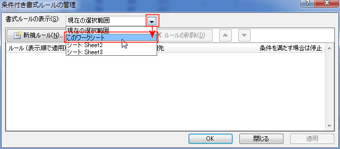 - 書式ルールの表示で「このワークシート」を選択します。