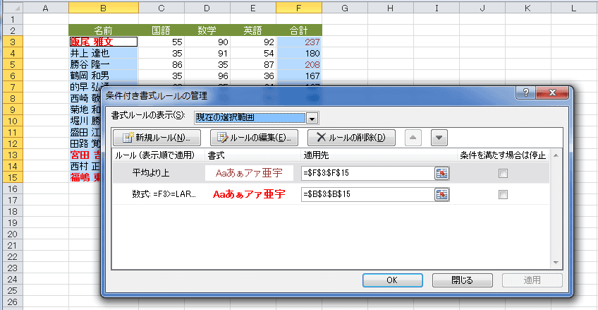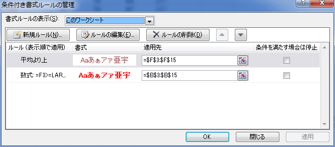 - このワークシートに設定してある条件付き書式の一覧が表示されました。