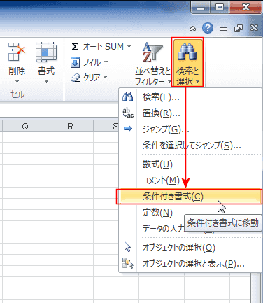 - [ホーム]タブの[検索と選択]→[条件付き書式]を実行します。
