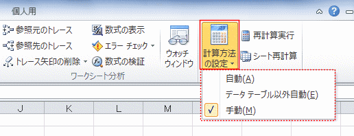 「手動」にチェックを入れると自動再計算はオフになり、セル値を変更しても再計算はされません。