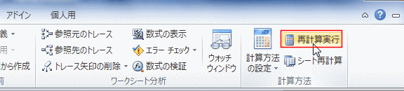 - 一時的に再計算するには「再計算実行」を実行するか、[F9]キーを押して再計算します。
