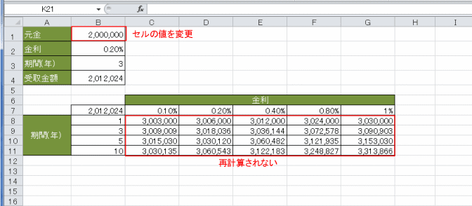 - B1セルの値を変更したが、データテーブル内は元の値のままで再計算されません。