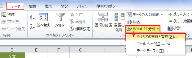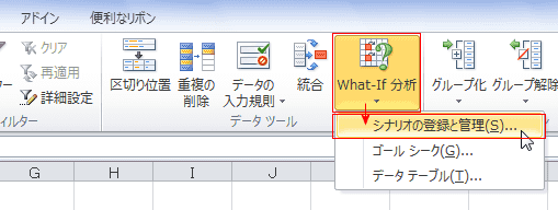 - [データ]タブの[データツール]グループにある[What-If分析]→[シナリオの登録と管理]を実行します。