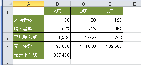 A店〜C店の入店者数から売上金額を推定するデータ表です。