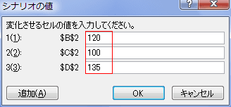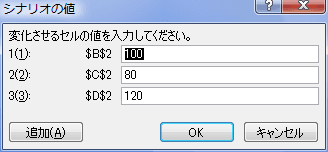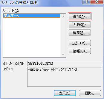 - シナリオ名に「基本データ」、変化させるセルに「$B$2,$C$2,$D$2」を設定しました。。