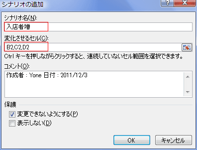 - シナリオ名に「入店者増」、変化させるセルに「B2,C2,D2」を設定しました。