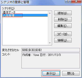 結果を表示したいシナリオ「入店者増」を選択し、[表示]ボタンをクリックします。
