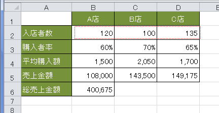 B2に「120」、C2に「100」、D2に「135」と入力しました。