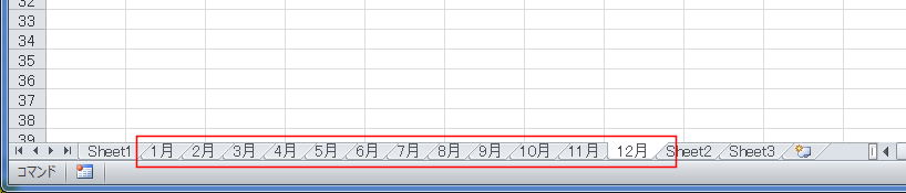 | Sub Sample01() Dim i As Integer For i = 1 To 12 Worksheets.Add After:=ActiveSheet ActiveSheet.Name = i & "月" Next i End Sub |