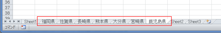 | Sub Sample02() Dim i As Integer Dim ShName As Variant ShName = Array("福岡県", "佐賀県", "長崎県", "熊本県", "大分県", "宮崎県", "鹿児島県") For i = LBound(ShName) To UBound(ShName) Worksheets.Add After:=ActiveSheet ActiveSheet.Name = ShName(i) Next i End Sub |