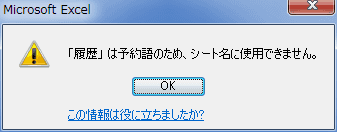 - 「履歴」は予約語のため、シート名に使用できません。 とメッセージが表示されます。