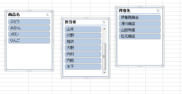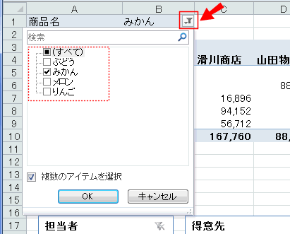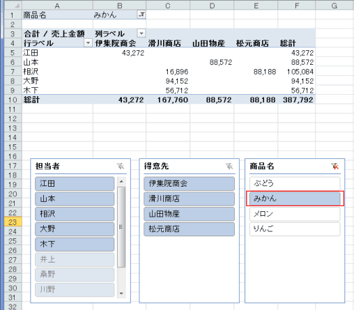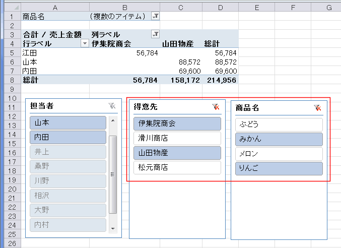 - 下図は「得意先」と「商品名」でそれぞれ複数のフィルターをかけています。