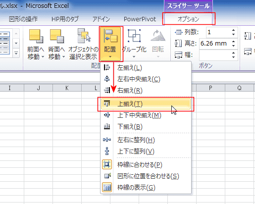 - スライサーツールの[配置]→[上揃え]を実行します。