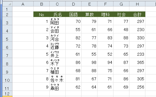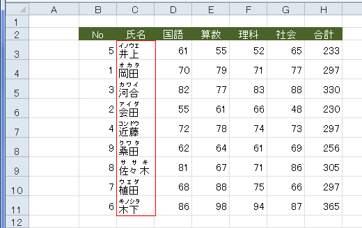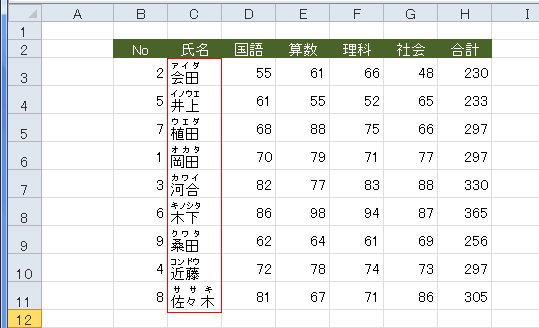 - 並べ替える文字列に「ふりがな」が有るか無いかによって、順序が変わることになります。