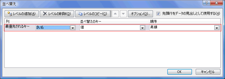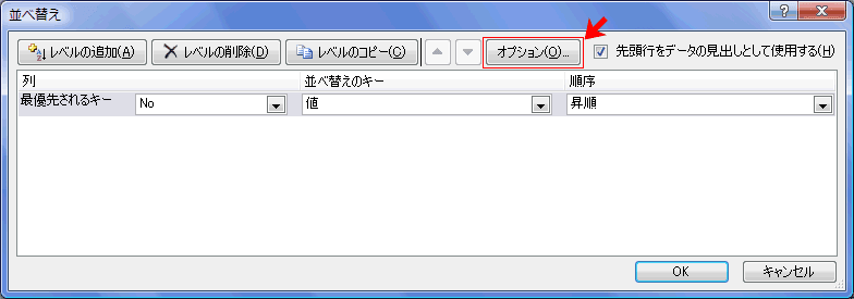 - [並べ替え]ダイアログで[オプション]を実行します。
