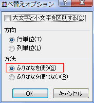 - 「並べ替えオプション」ダイアログの「方法」で「ふりがなを使う」にチェックが入っているのを確認します。