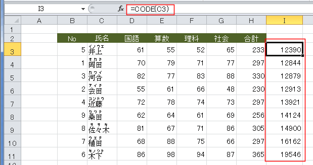 I3セルに =CODE(C3) と入力して、氏名の1文字目のコード番号を求めます。