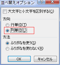 「並べ替えオプション」ダイアログの「方向」で「