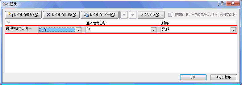 最優先されるキーで「行2」「値」「昇順」を選択し、[OK]ボタンをクリックします。