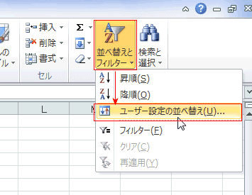 または、[ホーム]タブの[編集]グループにある[並べ替えとフィルター]→[ユーザー設定の並べ替え]を実行します。