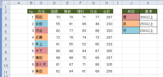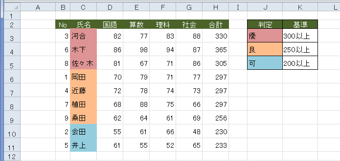 - 下表の「氏名」が色分けしてあります。この色を条件にして並べ替えてみます。