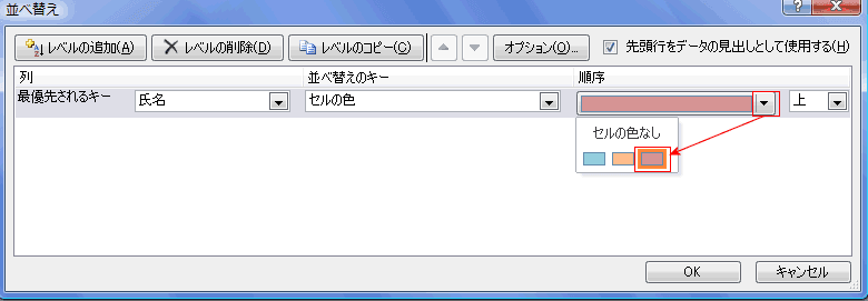 - 「並べ替えのキー」で「セルの色」を設定します。