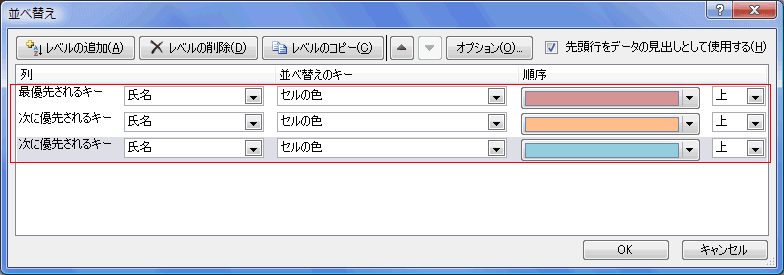 - Excel2007以降ではセルの色やフォントの色が付けてある場合、その色に基づいた並べ替えができるようになりました。