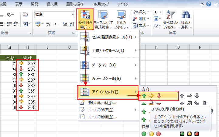 [ホーム]タブの[条件付き書式]→[アイコンセット]→[3つの矢印]を選択しました。