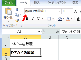 - ここでフォントの前に「@」を入れると左に90度寝たタ文字が表示できます。