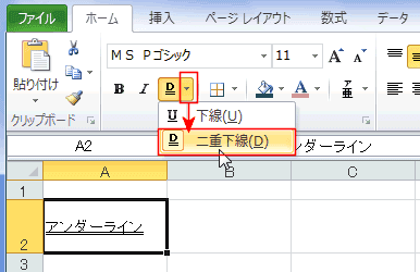 - 二重線を引くには[下線]ボタンの右の▼ボタンをクリックして[二重下線]を選択します。