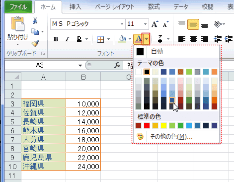 - [塗りつぶしの色]ボタンの右の▼をクリックしてドロップダウンから適切な色を選択します。