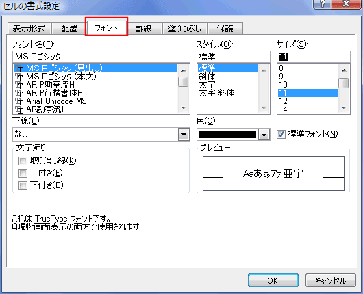 - セルの書式設定ダイアログボックスの「フォント」タブが表示されます。