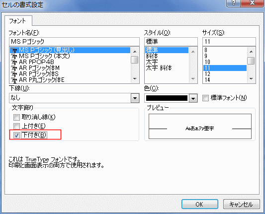 文字飾りの「下付き」にチェックを入れ、[OK]ボタンをクリックします。