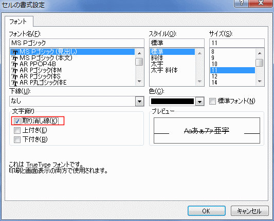 文字飾りの「取り消し線」にチェックを入れ、[OK]ボタンをクリックします。