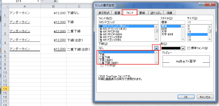 - 下線はリボンにある下線コマンドに加え[会計]の2種類が設定できます。